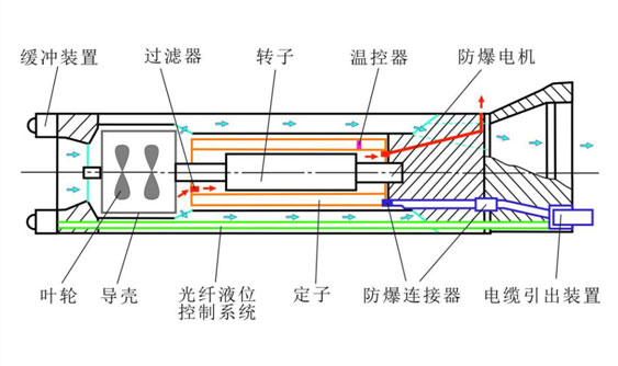部分液體在電機内部快速穿過,沿紅色箭頭所示線路與潛油泵外物料彙合,實現系統大循環